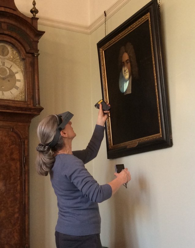 Ruth Bubb examining one of the Dr Williams's Library portraits.
